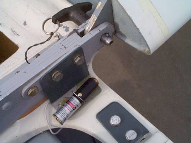 Laser pointer mounted to the forward left drag-spar fitting on fuselage. The small piano-wire clips rotate over the laser switch buttons, to hold the switches "on", as needed. I slotted the end caps for easy replacement of batteries in this tight location. A magnet is handy here for removing depleted batteries. Power from the glider battery might be a desirable option.