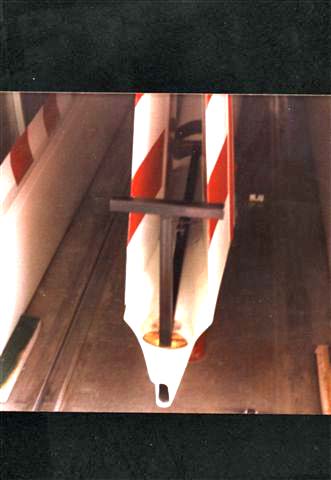 3) Make a pad shaped to fit the top of the fuselage with some felt. I cut off a piece from a two by four, shaped it and attached it to the sq. tubing just ahead off the leading edge of the fairing. At the other end I also used a form shaped pad with felt, touching the cone fairing. As you tighten the unit to the bracket, which was installed to the bulk head, there should only be a slight pressure on the cone. When traveling it is important that the assemble is tightly bolted as vibration could loosen and wear the thread and the bolt out. Now attach and weld T-bar, as well as the vertical post with pads, that will hold the folded V tail in place.
